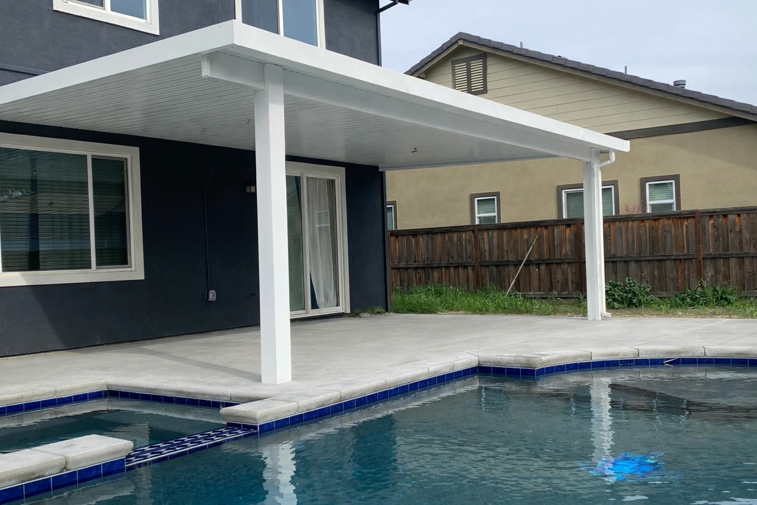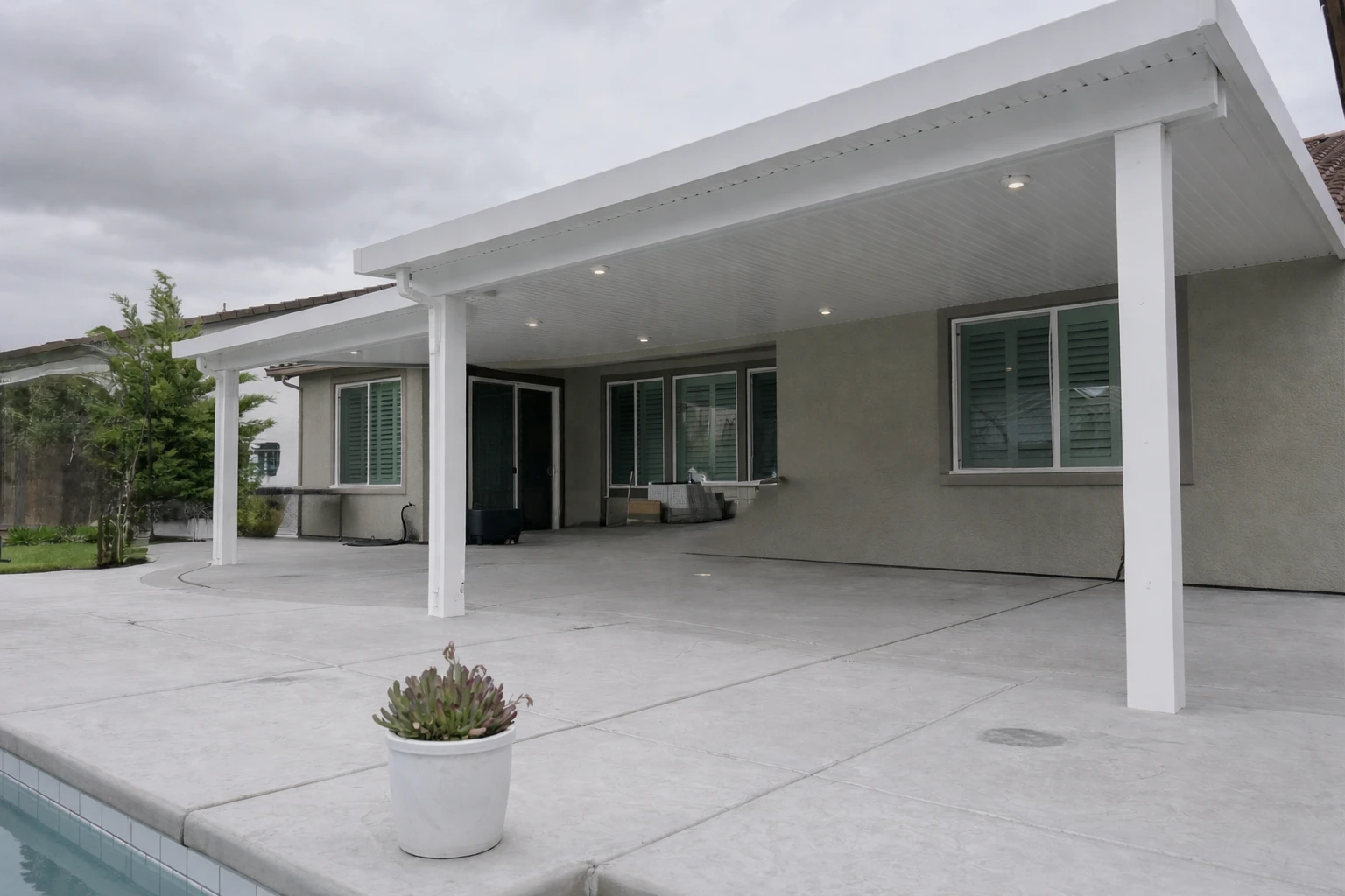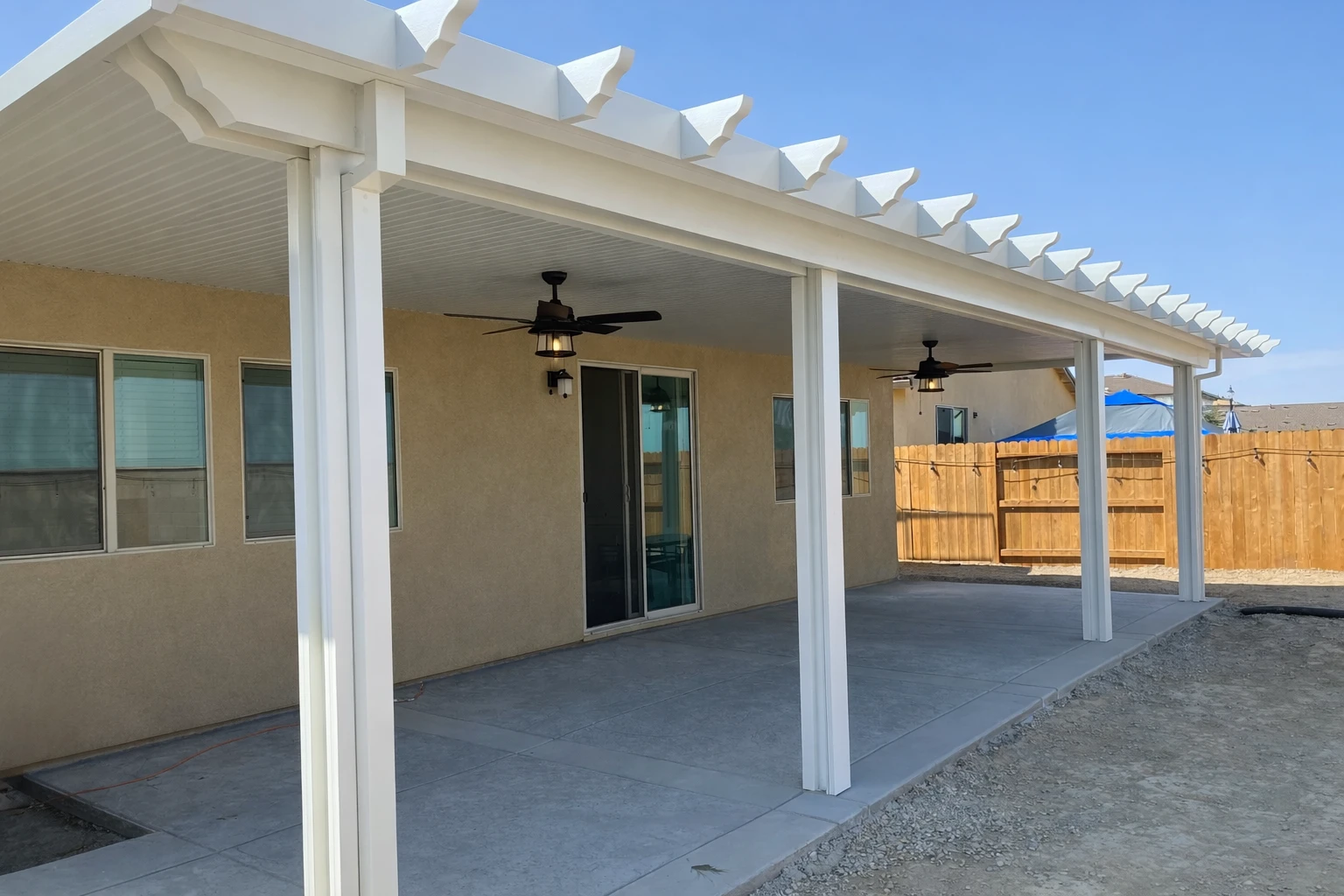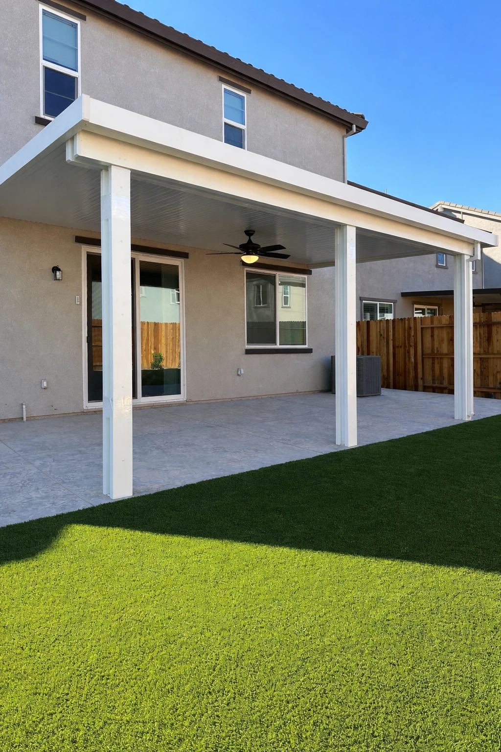 White Attached Solid Patio Cover Modern Backyard